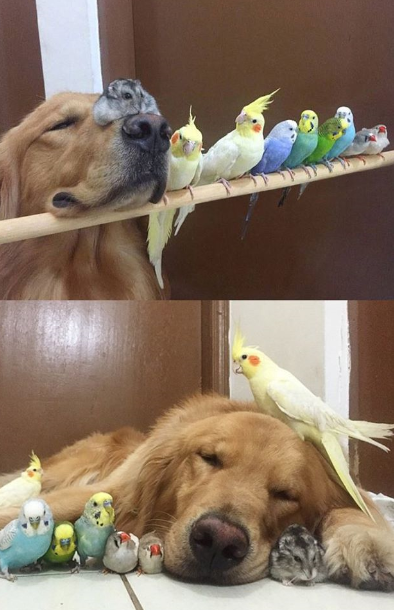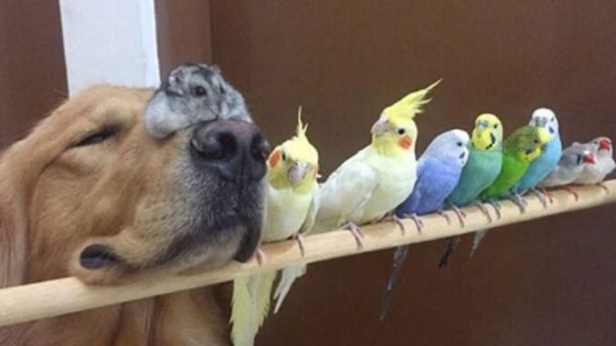 Bob, a gentle golden retriever, shares his life with a tiny hamster and eight vibrant birds. Despite their obvious differences, they live together in complete harmony.