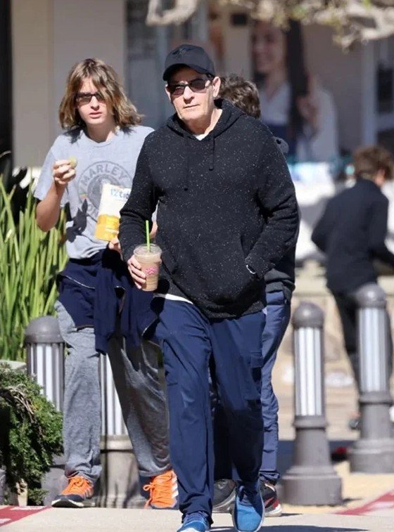 Trion sågs dricka smoothies och dela snacks medan de var avslappnat klädda för det soliga vädret. Sheen, 59, bar en vit skjorta, blå byxor, en huvtröja och en keps. Max och Bob, som nu är lika långa som sin pappa på 178 cm, bar matchande solglasögon som förstärkte deras likhet ytterligare.