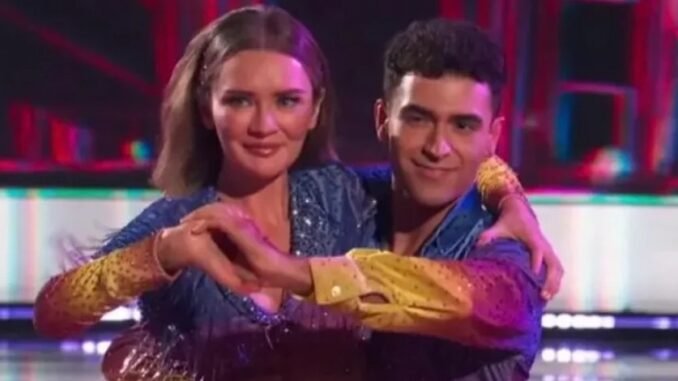 Gemeinsam mit ihrem Profitanzpartner Ezra Sosa präsentierte sie sich in einem blau-violetten Outfit, das durch das Fußkettchen ergänzt wurde.
