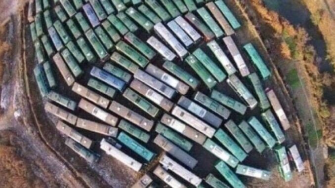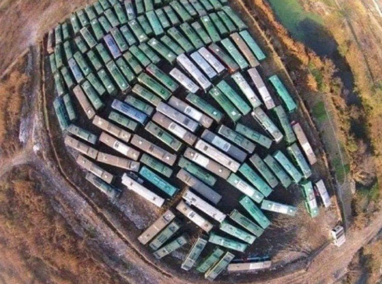 Fotot togs från en helikopter över Hangzhou i Kina. Det som först såg ut som leksaksklossar var i själva verket långa rader av parkerade bussar på en enorm parkeringsplats.