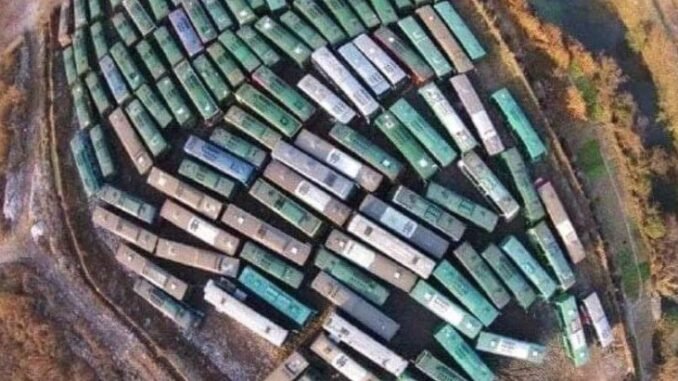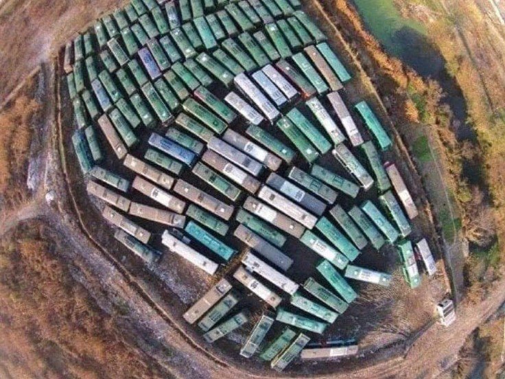 Das Foto wurde aus einem Hubschrauber über Hangzhou, China aufgenommen. Was wie Spielzeug aussieht, sind in Wahrheit lange Reihen von geparkten Bussen auf einem großen Abstellplatz.