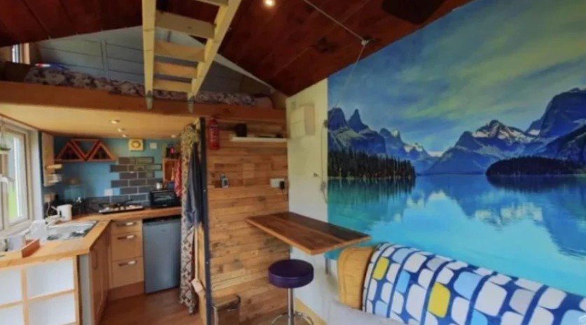 La mini-maison se dresse sur la propriété de son grand-père et s’intègre harmonieusement au paysage grâce à son charme de cottage anglais. Le projet a débuté avec une vieille caravane que Tom a achetée et transformée au cours de son apprentissage en menuiserie.