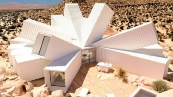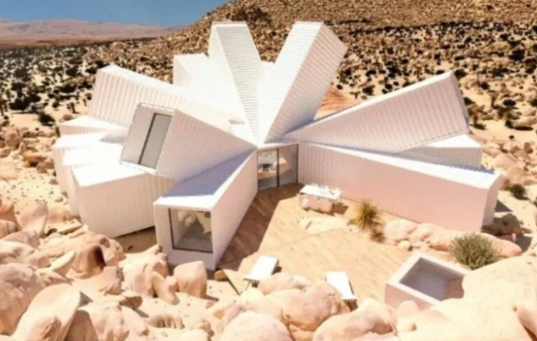 La vivienda final ocupa aproximadamente 193 metros cuadrados y está construida íntegramente con contenedores reciclados organizados en una espectacular formación con forma de estrella. Su diseño combina una estética futurista con la belleza agreste del entorno desértico.