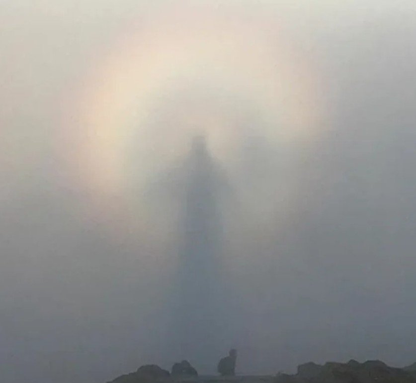 Selon les spécialistes, le spectre de Brocken se produit lorsque le soleil est bas à l’horizon et projette l’ombre d’un randonneur sur un mur de nuages ou de brouillard. L’ombre paraît souvent agrandie et entourée de cercles colorés, donnant l’illusion d’une silhouette fantomatique auréolée de lumière.